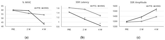 The SSR measurement for the HMG showed a decreased latency with increased amplitude at 4 W and at 2 W. However, for the PTG, the latency decreased, and amplitude increased at 4 W and at 2 W, respectively, with similar results for PRE. In comparison between the two groups, the latency, and amplitude of the SSR were significantly different at 2 W and 4 W compared to at PRE (p < 0.05) (Figure 3).