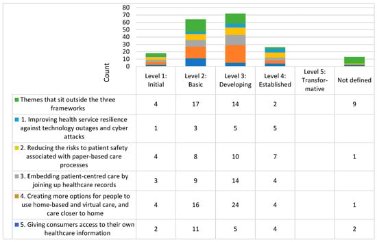 Histogram of self-rated digital maturity across the eight health services. NB each number represents the number of times (counts) the domain and level were mentioned in the focus groups.