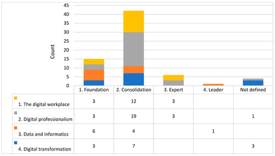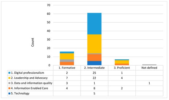 Based on Victoria’s Digital Health Roadmap 2021–2025 [19], the majority of self-ratings of digital maturity was developing (level 3 of 5) with no level 5 transformative ratings (Figure 1). Based on the National Nursing and Midwifery Digital Health Capability Framework [15], nursing and midwifery mostly identified an intermediate level (level 2 of 5) of capability relating to digital professionalism, leadership, and advocacy (Figure 2). Based on the Digital Health Capability Framework for Allied Health Professionals [28], self-rated allied health digital capability was most commonly identified at a consolidated level (level 2 of 4) of capability relating to the digital workplace and digital professionalism (Figure 3).