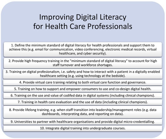 To conclude, there is a gap between the digital capability of the current health workforce and the need for the rapid deployment of high-quality digital healthcare to patients with a wide range of health conditions. Leaders from allied health, nursing, and midwifery professions articulated clear strategies to improve the digital literacy of healthcare professionals. These await consistent implementation nationally and globally.