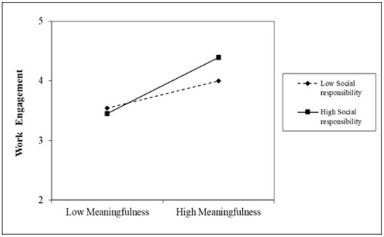 Hypothesis 3 proposed that a social responsibility climate moderates the effect of work meaningfulness on work engagement, such that the effect is stronger when a social responsibility climate is high rather than low. The HLM results in Model 3 demonstrate a significant interaction between work meaningfulness and a social responsibility climate (b = 0.13, p = 0.03). We probed the interaction between work meaningfulness and the social responsibility climate by taking one standard deviation above and below the mean to indicate high and low levels. As shown in Figure 2, the simple slopes revealed that the effect of work meaningfulness on work engagement was stronger when a social responsibility climate was high (r = 0.44, p = 0.000) rather than low (r = 0.23, p = 0.000). Therefore, Hypothesis 3 was supported.