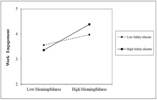 A safety climate moderates the effect of work meaningfulness on work engagement, such that the effect is stronger when a safety climate is high rather than low.