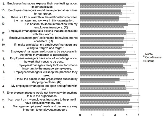 The priory hypotheses were tested using correlational analyses, which are shown in Table 4, and all the hypotheses were confirmed. Positive correlations were detected between the scale domains with the intention to leave variables and satisfaction levels, indicating higher trust in participants with no intention to leave. Negative correlations were shown between scale domains and organizational commitment, indicating higher trust scores in participants with higher organizational commitment.