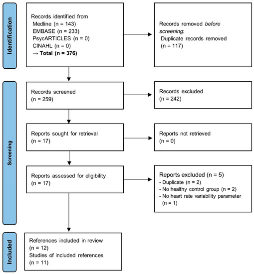 A total of 376 documents were retrieved from the database. Of these, 117 duplicates were removed. The remaining 259 documents were screened for eligibility based on the titles and abstracts, and 242 irrelevant documents were excluded. The full texts of the remaining 17 documents were reviewed; of these, two were excluded due to duplication [32,33], and the other two were excluded due to the lack of a healthy (or uninfected) control group [34,35]. The last one was excluded because the study did not report HRV parameters [36]. Finally, 11 studies in 12 documents [37,38,39,40,41,42,43,44,45,46,47,48] were included in this review, of which, Mekhael et al. [45] (journal article) and Dagher et al. [48] (conference abstract) reported different outcomes for the same study. In dealing with these two documents, we described characteristics and assessed methodological quality based on Mekhael et al. [45], but we extracted HRV parameters from Dagher et al. [48]. The overall process of study selection is presented in Figure 1.