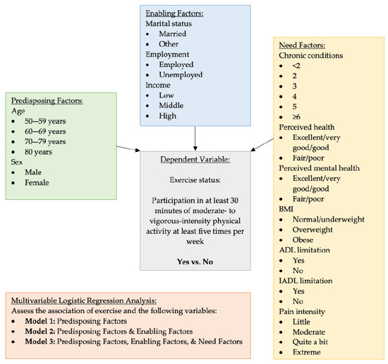 The MEPS cluster, strata, and weighting variables were used to account for the complexity of the MEPS design and to generate nationally representative population estimates. MEPS staff provide the cluster, strata, and weighting variables in the dataset for use by researchers in the analysis. The weighting is applied to all variables specified in the analysis. A detailed description of how the weighting variables were developed and how they should be applied by the researcher is provided in the MEPS documentation [27]. Nominal data were compared using chi-square tests. Multivariable logistic regression models were used to determine statistically significant associations between predisposing, enabling, and need factors with exercise status. Only variables that were shown to be significant in the univariate analysis were included in the multivariable logistic regression models. Logistic regression model 1 included predisposing factors (age, sex). Logistic regression model 2 included predisposing factors and enabling factors (age, sex, marital status, employment, income). Logistic regression model 3 included predisposing factors, enabling factors, and need factors (age, sex, marital status, employment, income, chronic conditions, perceived health, perceived mental health, BMI, ADL limitation, IADL limitation, pain intensity). The participants who reported that they exercised regularly were modeled, while those who reported that they did not exercise regularly were used as the referent group. Adjusted odds ratios and 95% confidence intervals (CI) were calculated. Standard errors were calculated using the Taylor-series linearization approach. An alpha level of 0.05 was set a priori. Missing data for some variables are inputted by MEPS staff when possible following MEPS coding conventions, which can include supplemental data from the MEPS insurance component, medical provider component, or earlier interview panels [28]. Any missing data remaining were excluded from analyses. The analyses were conducted using SAS on demand for academics (SAS Institute Inc., Cary, NC, USA) and PROC SURVEY commands to apply the cluster and strata variables. An overview of the analytical approach is provided in Figure 1.