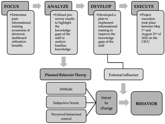 The current literature highlights an assessment of the population’s knowledge and its likelihood to change prior to any large-scale modifications, as it will alleviate the resistance when change is implemented [7,8]. The Planned Behavior Theory (PBT) is a cognitive theory that predicts one’s decision to engage in a particular behavior based on his or her intention to engage in that behavior [11,12]. Therefore, the stronger the intention to engage in the behavior, the more likely it will be performed [11,12]. We believed that this theory would help measure the degree of CICU providers’ behaviors of acceptance and adoption of innovative change in the medical realm, especially after providing education on why and how the electronic dashboard affects care practices and patient outcomes. Therefore, the PBT was used as a guide for the construction of the pre-bundle and post-bundle surveys, as shown in Figure 1.