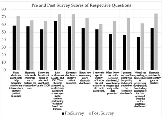 The results inputted into a paired t-test reflected an increased mean score of 7.38 points when the pre-bundle and post-bundle surveys were compared. The results yielded a statistically significant p-value of <0.001. Furthermore, a non-parametric Wilcoxon test was used due to the small sample size, and it also showed a statistically significant p-value of <0.001. According to these results, our educational training bundle positively correlates with the improvement of healthcare provider knowledge of electronic dashboards of those who fully participated in this project. The doctoral team further evaluated the mean score and the standard deviation of the questions to assess their attitudes, knowledge, skills, and application. The mean scores for attitude, knowledge, skills, and application improved by 14, 9, 8, and 12.33 points, respectively. Therefore, the CICU providers’ intent towards electronic dashboard use increased significantly when they were educated regarding the technology’s benefits as a means of improved care delivery and tracking quality indicators [3,10]. This improvement in the staff’s baseline knowledge increased the likelihood of their acceptance and willingness to adopt towards unit change. These key findings were consistent with the current literature: to decrease resistance to change, education of the population of interest must occur prior to implementation to ensure successful integration and sustainability of that change [7,8].