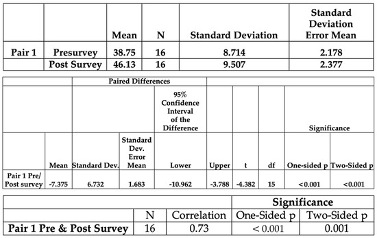 Survey results were analyzed and assigned numerical values for each varying degree of agreement on the Likert scale. The counts are used in Figure 2. Numerical values were analyzed using the International Business Machines Corporation Statistical Package for the Social Sciences, version 28. Figure 3 illustrates all participants’ pre-bundle and post-bundle survey summated scores, and Figure 4 displays the input scores in a paired t-test, yielding a statistically significant p-value of <0.001. The doctoral team recognized the small sample size of this project, therefore a non-parametric Wilcoxon test was used, as the literature recommends, to further fortify and affirm the results. The non-parametric Wilcoxon test also reflected a statistically significant p-value of <0.001 [13]. The surveys’ 12-question behavioral section was grouped into four categories: attitude, knowledge, skills, and application. Within each category, the summated scores were inputted into a paired t-test, from which the mean and standard deviations were derived.
