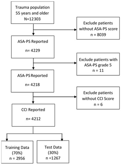 The inclusion criteria consisted of adult patients aged 55 years and older, who were admitted through the emergency department, and who received orthopedic trauma care between 2014 and 2020 (N = 12,303) (Figure 1). We used age 55 as the cutoff since injury-related mortality significantly increases from age 55 years and higher [4]. We restricted the data to cases that had an ASA-PS grade (n = 4229) and excluded cases that were ASA-PS grade 5 (n = 11). In this study, there were no patients with ASA-PS grade 6, and we excluded patients with ASA-PS grade 5 (n = 11) due to the small counts. Additionally, we excluded cases without reported CCI values (n = 6). The final dataset (n = 4223) was split, using a simple random sampling technique, in a 70:30 ratio into the training dataset (n = 2956) and the test dataset (n = 1267). The training dataset was used for modeling the relationship between ASA-PS and CCI, while the test dataset was used for internal validation.