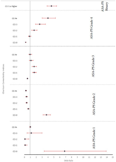 Using the LASSO selection technique, four of the five multivariate models (ASA-PS 2, 3, 4 and ASA-PS Binary) included age, sex, marital status, and BMI as control variables. The LASSO selection excluded marital status from the ASA-PS grade 1 model. A CCI value of zero was most predictive of ASA-PS grades 1 and 2 with adjusted odds ratios (AOR) of 6.83 (95% CI: 3.36–13.90) and 3.75 (95% CI: 3.16–4.45), respectively (Figure 2). CCI values of 1 (AOR: 1.67; 95% CI: 1.41–1.98) and 2 (AOR: 1.64; 95% CI: 1.31–2.05) were most predictive of ASA-PS grade 3. CCI values of 2, 3, and 4 were predictive of ASA-PS grade 4, and the adjusted odds ratio increased in a dose–response pattern from 1.65 (95% CI: 1.25–2.17) to 2.59 (95% CI: 1.88–3.58) to 4.00 (95% CI: 3.02–5.29). A CCI of 1 or higher was predictive of a high-risk surgical group (ASA-PS 3 or 4) with an AOR of 4.59 (95% CI: 3.85–5.86).