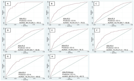 Figure 3. Area under the receiver operating characteristic curve assessing the accuracy of the most predictive CCI category in predicting each ASA-PS grade using the test dataset. (A) CCI-0 as a predictor of ASA-PS 1; (B) CCI-0 as a predictor of ASA-PS 2; (C) CCI-1 as a predictor of ASA-PS 3; (D) CCI-2 as a predictor of ASA-PS 3; (E) CCI-2 as a predictor of ASA-PS 4; (F) CCI-3 as a predictor of ASA-PS 4; (G) CCI-4 as a predictor of ASA-PS 4; (H) CCI-1+ as a predictor of ASA-PS Binary.