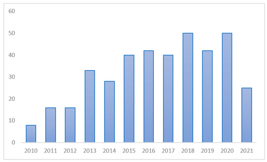 Eight articles were published in 2010 and 16 in 2011, which was an increase of 100%. Since then, more than 20 articles have been published each year, with 50 articles published in 2020. However, there was a temporary drop in the number of articles published in 2021 through June (Figure 2).