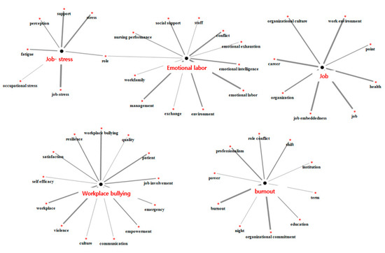 “Job stress”, “burnout”, “organizational commitment”, “job embeddedness”, “stress”, “workplace bullying”, “conflict”, “professionalism”, “organizational culture”, “role conflict”, and “fatigue” were among the top 30 keywords in terms of frequency and all three types of centrality. “Job satisfaction”, “work”, “experience”, “satisfaction”, and “work–family” were among the top 30 keywords for all three categories of centrality but did not rank among the top 30 in terms of frequency.