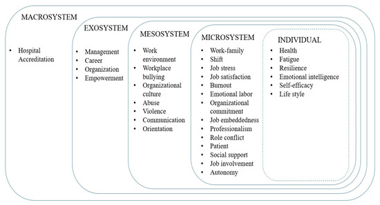 As a result of classifying the keywords included in Table 2 according to the Ecological Systems Theory [18], most of the keywords were included in the microsystem including at the individual level. The number of included keywords decreased as the system was expanded to mesosystem, exosystem, and macrosystem (Figure 4).