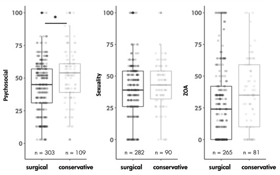 Comparison of the quality of life in the subscales “psychosocial”, “sexuality” and “satisfaction-upper arms” of the two patient groups weight loss by conservative measures vs. weight loss by surgical measures. The box plots represent the median, the interquartile range and the distribution. Statistical differences were examined using the Wilcoxon test. The significance level is * p < 0.