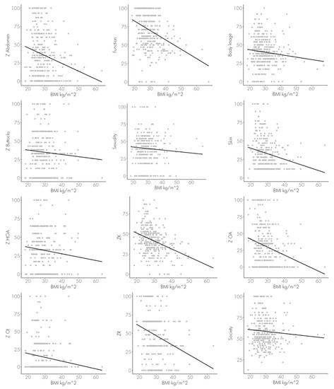 Regression analysis and Pearson’s correlation of the patients’ BMI and selected headings of the BODY-Q questionnaire: body image, sexuality, society, satisfaction-abdomen (Z Abdomen), satisfaction-body (ZK), satisfaction-upper arms (ZOA), satisfaction-back (ZR), satisfaction-buttocks (Z Buttock), satisfaction-hips and outer thighs (ZHOA), satisfaction-inner thighs (ZOI), assessment of excess skin (Skin).