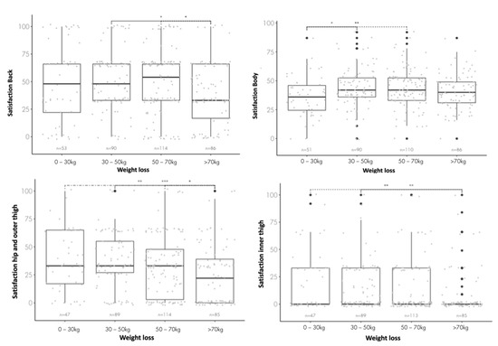Representation of satisfaction-back/-body/-hip and outer thigh/-inner thigh categorized according to the amounts of weight lost. The boxplots show the median with the corresponding interquartile range and the distribution of the group. The statistical differences were calculated using the Kruskal–Wallis test and the subsequent post-hoc analysis was performed using the pairwise Wilcoxon test; significance level: * p < 0.1; ** p < 0.05, *** p < 0.01.
