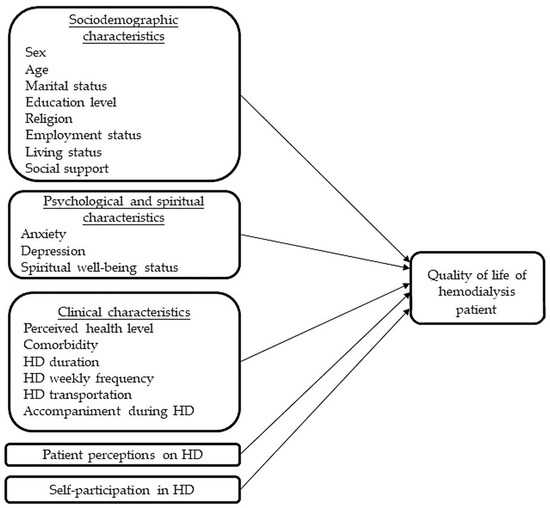 The independent variables of this correlational study framework were sociodemographic, mental and spiritual, and clinical characteristics, perceptions of HD, and self-participation in HD, while the dependent variable was quality of life for determining the relationship between the independent variables and the dependent variable (Figure 1).