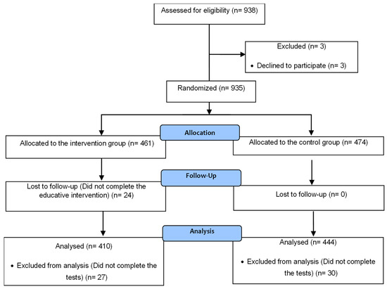 The sample size required for the study was calculated taking into account the fact that the adolescent population in Murcia, aged 14–18 years, was 80,108 in 2018. A sample size of 383 students was adequate to obtain a 95% confidence interval. Nonetheless, for this study, 938 secondary school students were selected. Permission to participate in the study was obtained from the management teams of the six schools as well as from parents or legal representatives. The exclusion criteria were refusal of consent (n = 3) and not understanding Spanish. Participants in the control group were offered the intervention at the end of the study. Participants who did not complete the educational intervention (n = 24) or did not complete the tests (n = 57) were excluded from the statistical analysis. Finally, 854 students completed the study, and their data were considered in the final dataset. This student sample was randomised into two groups (Figure 1): the intervention group (410 students) and the control group (444 students).