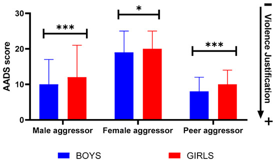 According to the data obtained on the AADS scale (where higher scores reflect lower violence justification), boys and girls showed different justification levels for physical violence (Figure 2). The main differences were observed regarding male and peer aggressors. Overall, boys showed greater justification of physical violence than girls (Figure 2). The most justified form of physical violence by both sexes was physical aggression (slapping) committed by a girl in response to previous verbal aggression (insult) committed by a boy, with 32.3% of the participants saying that they completely agree with this form of conflict resolution. The second most justified form of physical violence (31.1%) was physical aggression (pushing) committed by a girl in response to previous aggression (pushing) committed by a boy (specific data can be found in the Supplementary Materials: Figure S1).