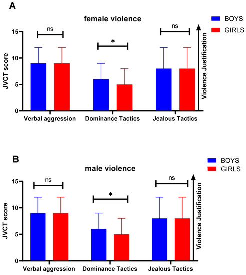 The level to which boys and girls justify female psychological violence (A) and male psychological violence (B), before the educational intervention, according to the sex of the aggressor, according to the JVCT scale. Data represent the mean ± sd. Significant differences between groups were analyzed by Mann–Whitney U-test. * p < 0.050; ns: no statistically significant differences.