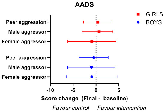 Analysis of comparative efficacy in boys and girls in the educational intervention group versus the control group, concerning the AADS scale. Data indicate intervention group changes (post-intervention − baseline) on the different AADS dimensions minus control group changes. Error bars indicate 95% CI of the change.