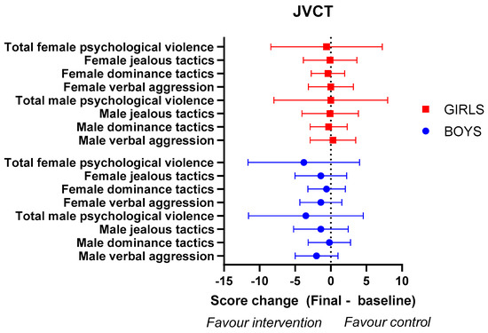 Comparative efficacy analysis between the boys in the educational intervention group versus the control group, concerning the JVCT scale. Data indicate intervention group changes (post-intervention − baseline) on the different AADS dimensions minus control group changes. Error bars indicate 95% CI of the change.