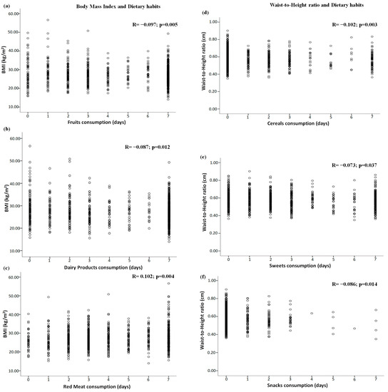 The significant correlations between dietary patterns and adiposity are shown in Figure 1. Pearson’s correlation test indicated a small negative correlation between the body mass index and fruit and dairy product consumption (all p < 0.02), and a small positive correlation between the body mass index and red meat consumption (p = 0.004) (Figure 1a–c, respectively). Small negative correlations were demonstrated between the waist-to-height ratio and cereal, sweet, and snack consumption (all p < 0.04) (Figure 1d–f, respectively).