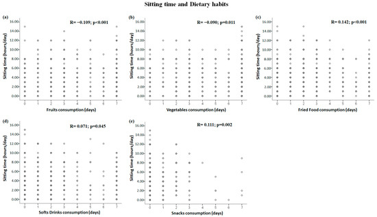 Significant correlations between dietary habits and sitting time domain: (a–e) correlations between sitting time and fruit, vegetable, fried food, soft drink, and snack consumption, respectively.