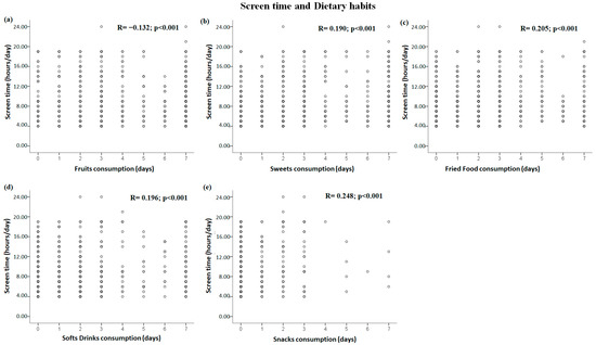 Significant correlations between dietary habits and screen time domain: (a–e) correlations between screen time and fruit, sweets, fried food, soft drink, and snack consumption, respectively.