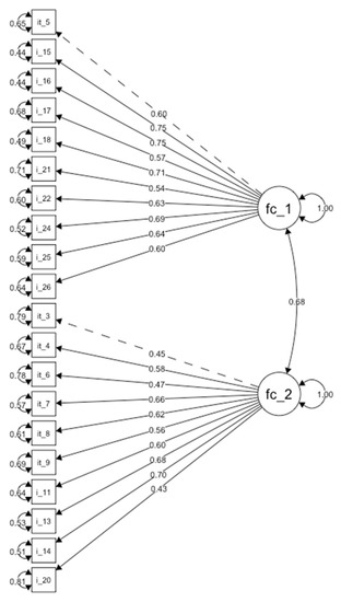 A two-factor model fit emerged in the EFA and was examined using CFA in the other subsample of 155 participants. Diagonally weighted least squares estimation was employed, and indicators were modelled as ordered categorical variables [20]. The goodness-of-fit tests provided initial evidence that the two-factor solution was an adequate fit with the item scores, because the ratio of the x2/df was 1.6 (critical ratio cut-off of 2.0), CFI = 0.99, GFI = 0.96, AGFI = 0.957, and RNI = 0.996, which were all above 0.95 [21], the traditional cut-off establishing adequate fit. Other evidence that generally indicated that the two-factor solution was a good fit with the data was an RMSEA of 0.022 [90% CI = 0.000–0.044], and an SRMR = 0.077 (an RMSEA and SRMR < 0.06 to 0.08 indicate an adequate fit) [21]. Item loadings on their latent constructs were statistically significant (p’s < 0.001), suggesting that all items were optimally related to their respective latent construct. The values of the estimated parameters between latent constructs and items are presented in Table 2 and Table 3 and Figure 2.