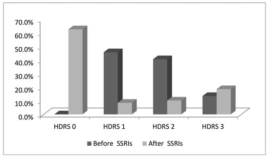 Given the heterogeneity of the study population and the small sample size, we focused on stage II COPD to analyze the effect of SSRIs. A clear difference in regard to a change in depression symptom severity, grouped according to HDRS score, was observed after SSRI treatment (χ2 = 29.98, df = 6, p < 0.05) in this group of patients. Before treatment, the largest number of patients belonged to groups 1 or 2 according to HDRS score, while there were no patients in group 0. After SSRI therapy, more than half of the patients were in group 0 according to HDRS score. More patients at stage II of COPD progressed from HDRS 2 to HDRS 3 after the administration of SSRIs (Figure 1).