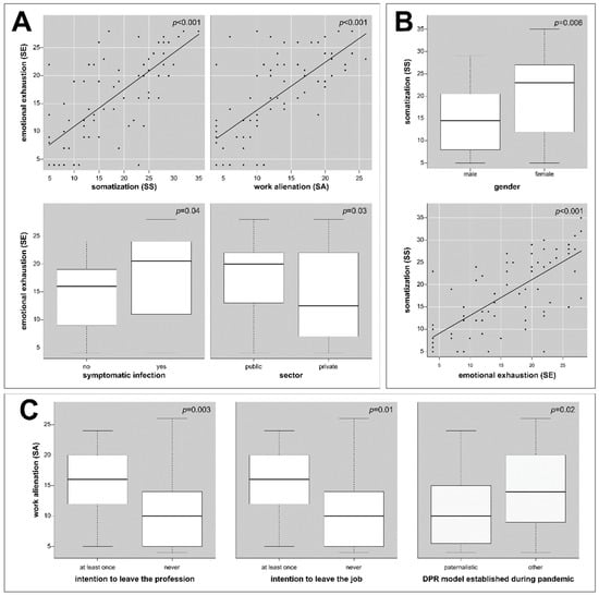 Scores of emotional exhaustion (A), somatization (B), and work alienation (C) by variables with statistical significance in Ecuadorian physicians who worked with COVID-19 patients. SE, scale of exhaustion; SS, scale of somatization; SA, scale of alienation.