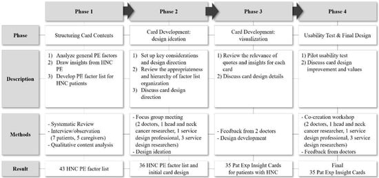 Key considerations and design directions were set to develop a card set based on the previously identified 43 HNC PE factor lists. by referring to the contents of Healthcare Experience Insight Cards developed by Villalba []. The key considerations were set as shown in Table 1 to develop an effective design for representing the experience of patients with HNC and discussing effective improvement plans through stakeholders’ shared understanding and effective brainstorming.