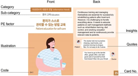 Insights and quotations for each PE factor are placed on the back of the card for users to understand the patients’ needs in detail and access their actual voices. Each insight and quote reflects the perspectives of medical staff, patients, and caregivers in various ways, and each stakeholder is visualized as an icon to distinguish between them. For each card, the card number is marked on the lower right corner of the back page, and the code number is marked on the lower left corner of the front page. Therefore, even if the cards are mixed, the types can be distinguished and classified using numbers (Figure 2).
