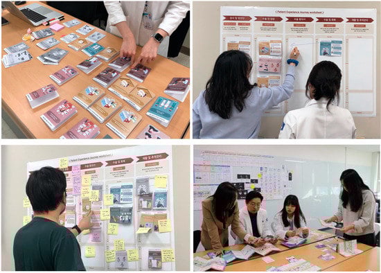 Patient experience (PE) is the totality of all interactions with the patient perspectives during treatment []. It is a significant factor in the quality of care directly related to the patient’s treatment results, safety, treatment effects, and doctor–patient interactions [,,]. PE is crucial for improving healthcare because it includes everything that occurs while a patient receives treatment and covers the emotional aspect [,]. As a methodology for improving healthcare, co-design workshops have recently been attracting attention []. Co-design is a creative improvement plan for designers to improve PE with various stakeholders, such as medical staff, patients, researchers, and caregivers, including non-designers [,,,]. In particular, experience-based co-design (EBCD) designs user experiences where medical staff and patients participate together to improve healthcare services [,,]. Identifying needs based on PE, seeking solutions, and presenting results are conducted through active stakeholder collaboration [,]. As an effective service improvement method for improving PE [,,], EBCD includes patients and other stakeholders with varied expertise [].