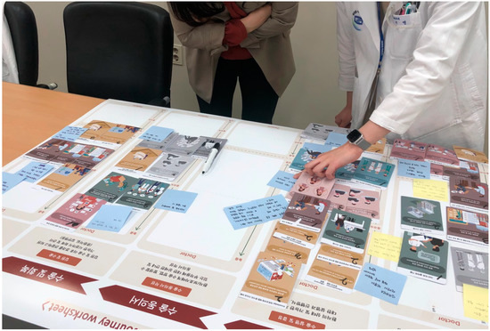 In phase four, a usability test was conducted using the completed card prototype, and the effectiveness of the card was verified. For evaluation, a co-creation workshop (25 March 2022) with the medical staff was conducted for two hours. The factors to be considered for improving HNC PE were divided into the patients’ and medical staff’s perspectives while discussing the importance, priority, and related cases. To maintain consistency of the stakeholders’ viewpoints, the participants who attended the second-phase meeting were involved in the workshop. A total of 35 EBCD cards were introduced to the medical staff, and each factor card considered important from the perspectives of the medical staff and patient was selected. When selecting a card, the relevant factor cards were pinned according to the stages of the HNC treatment journey. If the same card was repeatedly selected for each stage of the journey, extra sets of cards were provided when necessary. The priority and importance from the perspective of the medical staff were marked on the card, and they had time to exchange opinions about the reason for their selection. After selecting the factors that should be considered necessary for each stage of the treatment journey from the perspective of the medical staff, factors considered necessary from the patients’ perspective were discussed separately. Instead of having the patients directly participate in the workshop, medical staff who interacted closely with patients selected key factors for each stage of the journey based on their medical experience. To reflect the patient’s view, the medical staff selected the factors based on the complaints or requests that patients frequently express to the medical staff during treatment. By distinguishing this from their point of view and placing the cards on the journey map, the difference between the medical staff’s perspective and the patient’s perspective were compared.