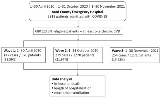 This retrospective, cross-sectional study was conducted at a tertiary hospital in the western part of Romania, Arad County Clinical Emergency Hospital, during the peak waves of COVID-19 pandemic in this country: 1–30 April 2020, 1–31 October 2020, and 1–30 November 2021. Data were extracted from the hospital electronic database system and included all hospitalized patients with a positive reverse transcription polymerase chain reaction (RT-PCR) for SARS-C-V-2 and at least one cardiovascular comorbidity, namely hypertension, IHD (comprising chronic coronary syndrome, old myocardial infarction, acute coronary syndrome, history of coronary aortic by-pass, or history of stent implantation), myocardial infarction, heart failure, atrial fibrillation, valvular heart disease, peripheral artery disease, myocarditis, pulmonary embolism, and stroke. There were no exclusion criteria, and all data records had information concerning the primary and secondary objectives of the study. Of 2919 patients admitted to the hospital during these three periods, a total of 680 eligible cases met the inclusion criteria.