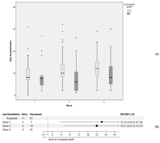 Table 3 presents the secondary outcomes (i.e., length of hospitalization and required mechanical ventilation) in relation to the primary outcome (i.e., in-hospital mortality). Since the relation was highly significant from statistical point of view, and the values in Table 1 proved a highly significant relationship between these two secondary outcomes and the three wave groups, we further investigated the two-way associations (Figure 2). While hospitalization significantly tended to increase over the three wave groups, in case of patients who died, it proved to have a high degree of variability (Figure 2a). In contrast, mechanical ventilation was significantly associated with a very high risk of in-hospital death across all three waves (Figure 2b).