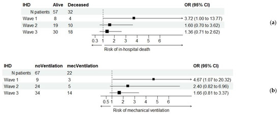 Relationship between ischemic heart disease (IHD) and the primary and secondary outcomes across the three waves: (a) odds ratio (OR) values for in-hospital death; (b) odds ratio (OR) values for mechanical ventilation.