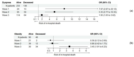 Odds ratio (OR) values for in-hospital deaths in relation to dyspnea (a) and obesity (b). The risk of in-hospital death associated with dyspnea was significantly decreased in wave 3 (Breslow–Day test, p = 0.022), although it remained statistically significant in all three wave groups. The risk associated with obesity was significant only in wave 3.