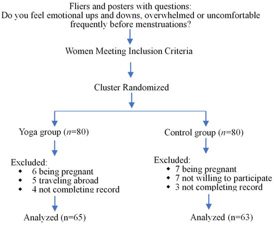 Women who met the inclusion criteria were given an explanation of the study and needed to be willing to complete a daily diary for three menstrual cycles. In order to avoid women in the two treatment groups inadvertently sharing information on the intervention (yoga exercise), a cluster design employing two geographically distinct districts to recruit for the experimental and control groups was utilized.