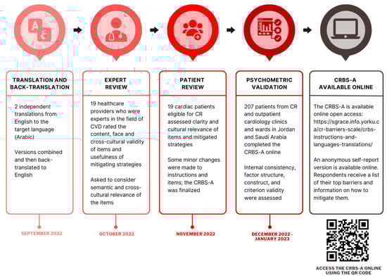 This was a multi-method study comprising (1) translation and cultural adaptation of the CRBS to Arabic using best practices [15], followed by (2) a cross-sectional survey of patients for psychometric validation. Figure 1 displays the multi-step translation, cross-cultural adaptation, and psychometric validation processes (dates provided). The study was approved by the King Abdullah Medical City (22-988; Saudi Arabia) and York University (e2021-013; Canada) research ethics boards.