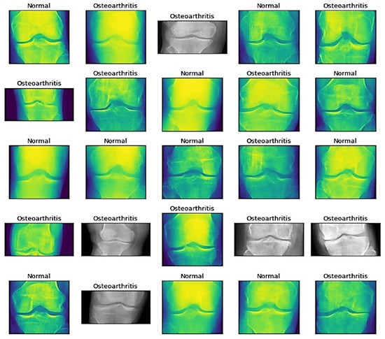 Osteoarthritis affects more than 3% of the population globally and is a major cause of disability in adults [12]. The diagnosis of OA is currently made through arthroscopy. Making an effective diagnosis is a complex process and requires a longer training time for a large dataset [10,12]; thus, automated systems based on machine learning techniques have been proven to be more efficient in the diagnosis and classification of OA from medical images. Various studies have been conducted in this regard. The authors in [13] developed an automated diagnostic system based on multivariate linear regression for detecting knee osteoarthritis from a sample of 1024 knee X-ray images. This method achieved 82.98% accuracy in the classification of osteoarthritis. In [14], the authors developed a framework based on Zernike-based texture analysis and deep learning that improves the accuracy percentage of diagnostic systems by 11%. In [15], the authors investigated the effect of MRI and patients’ data on the prediction of knee osteoarthritis based on various deep learning models. In this study, the best performance in the diagnosis of OA was achieved by the CVAE model, with an AUC score of 66.99%. The authors of [16] suggested a stacked model based on the patellar texture and clinical features of radiological images and second-level machine learning. This model achieved an AUC score of 88.9% in the classification of knee osteoarthritis. A novel diagnostic and grading tool was developed in [17] for the analysis of X-ray images of OA based on the Kellgren–Lawrence (KL) grading system. In [18], the authors developed a novel algorithm based on various machine learning techniques, such as logistic regression, KNN, decision trees, and SVM, for the early classification of knee OA from X-ray images. This algorithm has achieved a classification accuracy of 91%. In [19], the authors suggest a phono-arthrography (PAG) technique for the detection and classification of knee OA. This technique is currently in the development phase; however, initial results have shown great accuracy in the classification of knee OA. The authors in [20] reported that they had developed a convolutional neural network (CNN) for the classification of knee OA from X-ray images. In the classification of knee OA from X-ray images, this model achieved an accuracy of 90.01%, with 90% recall and 87.8% specificity. The authors in [21] developed and analyzed the effectiveness of the AlexNeT model in predicting and classifying knee OA from X-ray images. In [22], the authors proposed an image super-resolution algorithm based on an improved multiscale wide residual network model for detecting knee OA from knee MRI scans. This algorithm achieved a classification accuracy of up to 95%. The authors in [23] suggested a localization model integrated with ONNX and YOLOv2 for the prediction of knee OA from radiographic images. This integrated model achieved 0.98 mAP for the localization of OA images. In [24], the authors proposed a fuzzy ensemble feature selection method for the prediction and classification of knee OA from radiographic images. The suggested method achieved an accuracy of 73.55% in the classification of OA.
