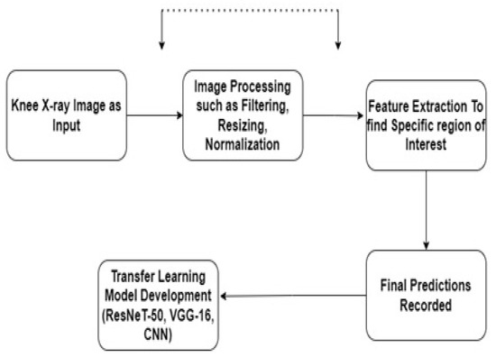 - Feature extraction: Feature extraction is carried out to identify the important features for the model to predict knee osteoarthritis. In this study, we used pretrained VGG16 [26] and ResNeT50 [27] models, which were trained on millions of natural images, to extract features from the knee X-ray images. By fine-tuning the VGG16 and ResNeT50 models on the knee X-ray images, the transfer learning model learns to identify the key features associated with knee osteoarthritis, such as joint space narrowing and osteophyte formation.