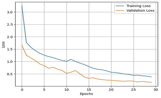 The overall training accuracy achieved for the ResNeT-50 model is 98.47%, and the overall testing accuracy achieved is 90.63%. For a clear understanding of the performance of the model, plots of validation loss and accuracy were obtained and are depicted in Figure 10 and Figure 11, respectively.