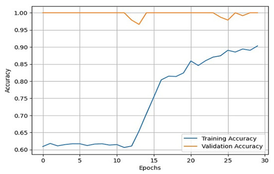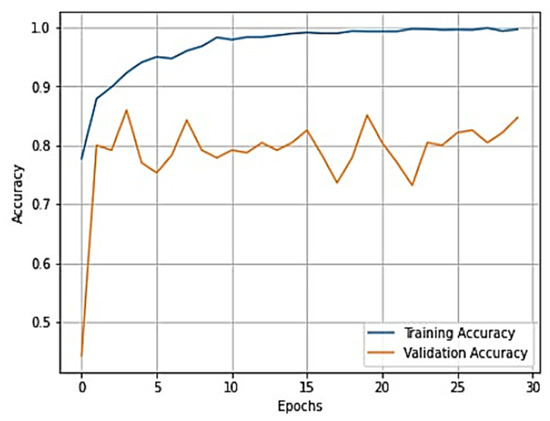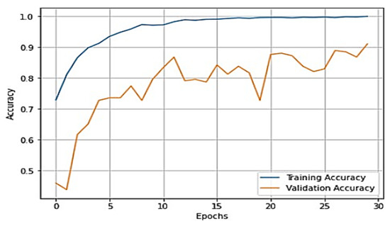 In this algorithm, b is the optimization variable, is the stochastic gradient at step j, is the non-increasing sequence, and is an arbitrary function that generates an output vector of the same dimension as that of b. During the training of our model, we used a dropout of 0.5, which implies that randomly selected neurons are removed from the training of our model to prevent it from overfitting. The process of the removal of neurons is explained by [44]. Upon training the model, we achieved a training accuracy of 93.53% and a testing accuracy of 90.95%.