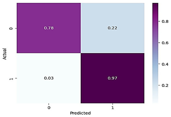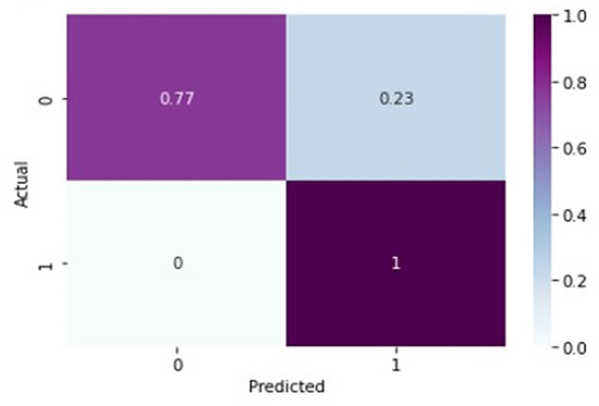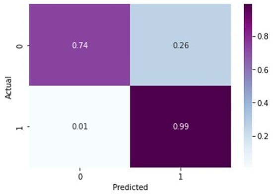 In Table 3, for normal knee X-ray prediction, where osteoarthritis is absent, the model has a precision of 0.94, which means that out of all the positive predictions made by the model, 94% of them are actually true positives. The recall value of 0.78 means that the model correctly identified 78% of all actual positive samples. The F1 score of 0.85 is the weighted average of precision and recall and provides an overall measure of the model’s performance. An F1 score closer to 1 indicates a better performance of the model. Based on these results, the model has a high precision value, indicating that it has a low false-positive rate. However, the recall value is lower than the precision value, indicating that the model may have missed some positive samples. The F1 score of 0.85 indicates that the model’s performance is reasonably good, but there is still some room for improvement. On the other hand, in the presence of knee osteoarthritis in X-rays, a precision of 0.90, a recall of 0.97, and an F1 score of 0.94 mean that the model performs very well in identifying arthritis cases from knee X-ray images. A precision of 0.90 means that out of all the predicted arthritis cases, 90% of them are true arthritis cases, and the remaining 10% are false positives. A recall of 0.97 means that the model has correctly identified 97% of all arthritis cases present in the dataset. Additionally, an F1 score of 0.94 means that the model performs very well in both precision and recall. Therefore, based on these evaluation metrics, we can conclude that the arthritis detection model has a high accuracy in identifying arthritis cases from knee X-ray images. To further predict the quality of the model on the data, a normalized confusion matrix was drawn, which is shown in Figure 6. All these metrics signify that this model performs well in predicting osteoarthritis from knee X-ray images.