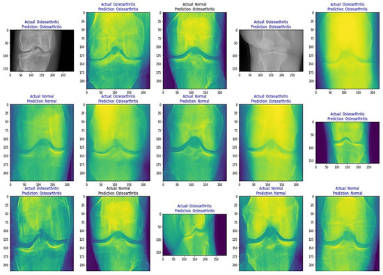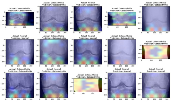 From Table 8, it is evident that the pretrained VGG-16 model achieved a higher training accuracy and testing accuracy and outperformed the other two models. Thus, VGG-16 is a more suitable model for the early prediction of knee osteoarthritis from X-ray images. To visualize the predictions, we generated visualizations of the predictions for some random images from the dataset to show the effectiveness of the most accurate model. The accuracy is further confirmed through Grad-CAM visualization. These are shown in Figure 13 and Figure 14, respectively.