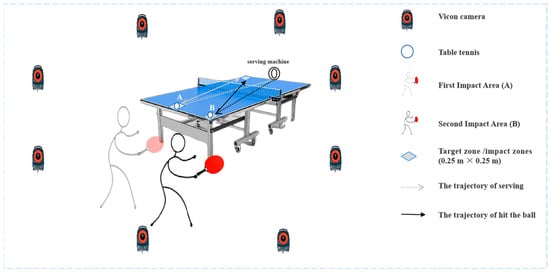 Before the data collection, all participants were familiar with the experimental environment. They were asked to do a specific 20 min warm-up, which included jogging on a professional treadmill and performing a multi-ball training for 10 min with the topspin forehand loop. As shown in Figure 1, the test was conducted at the Table Tennis Training Center at Ningbo University. The experimental process included one target zone and two impact zones (0.25 m × 0.25 m) tracing upon a professional table tennis table (Rainbow, Double Happiness Sports Company, Shanghai, China). Athletes were asked to hit the ball in the first impact area (A), move quickly to the second impact area (B) with a chasse step, and then participants stroked with maximal power to the target zone. Data was collected only when the forehand topspin loop was performed in the second impact area (B). All test balls were served from a serving machine, which had the same angle, speed, and frequency settings. All participants were informed of the experimental requirements and procedures. During the test, all participants wore the same table tennis match shoes and used the same table tennis racket. Participants were asked to hit balls (D40+, Double Happiness Sports Company, Shanghai, China) with their maximum effort onto the target zone (diagonal shot) just as they would do in a formal match. If the balls were hit out of bounds or into the net, the trials were not considered. Each participant successfully completed at least ten trials, and the kinematics of each trial were recorded synchronously.